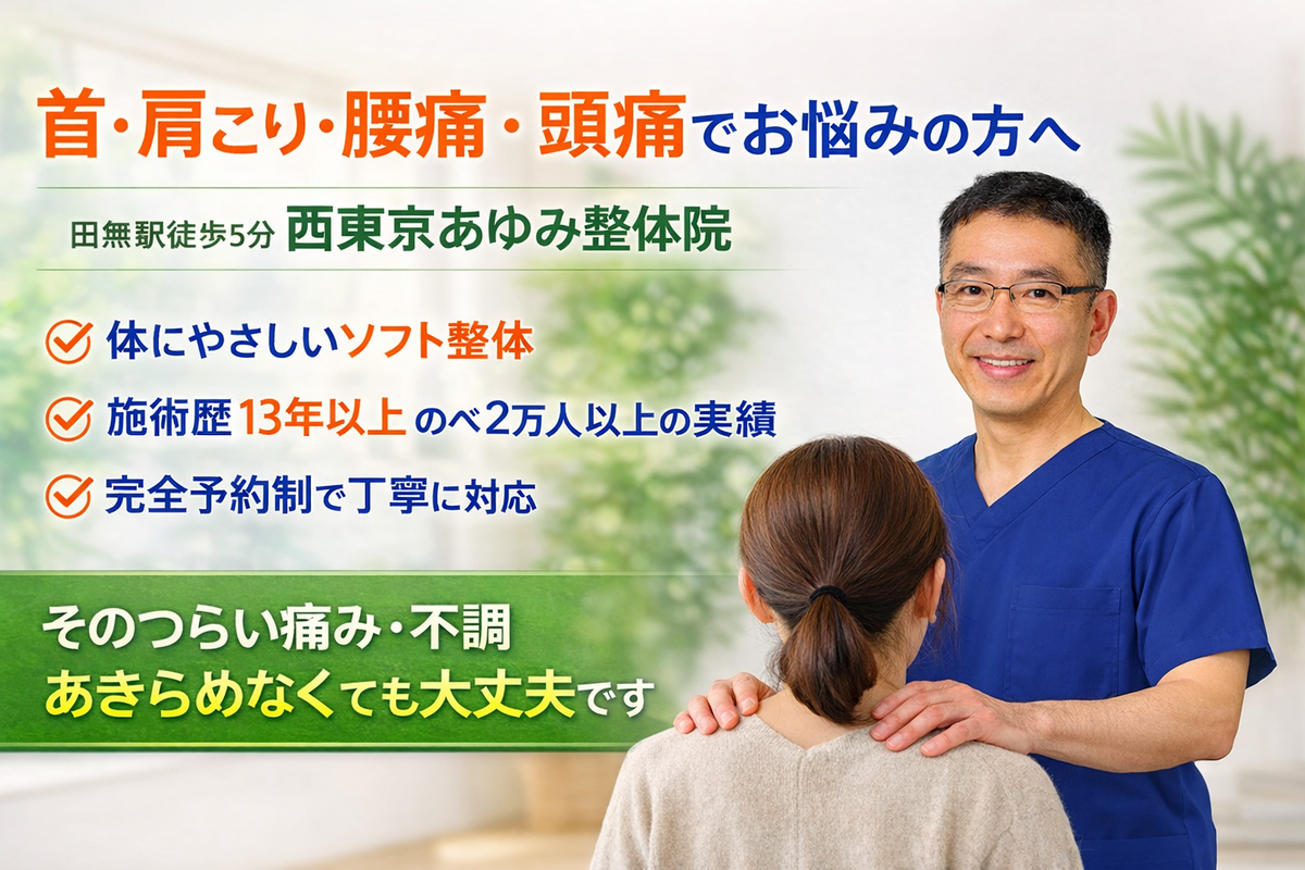 西東京あゆみ整体院は、慢性的な痛みや体の不調でお困りの方に、