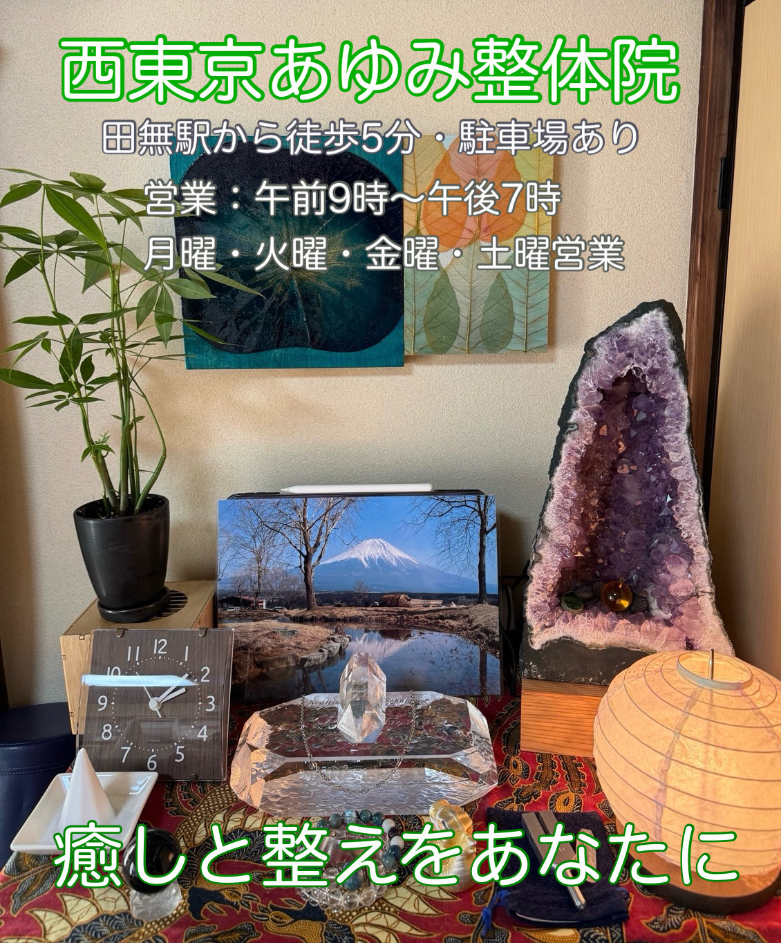 「西東京あゆみ整体院」は、肩こり・腰痛・疲労感など、日常の不調をやさしく整える整体院です。